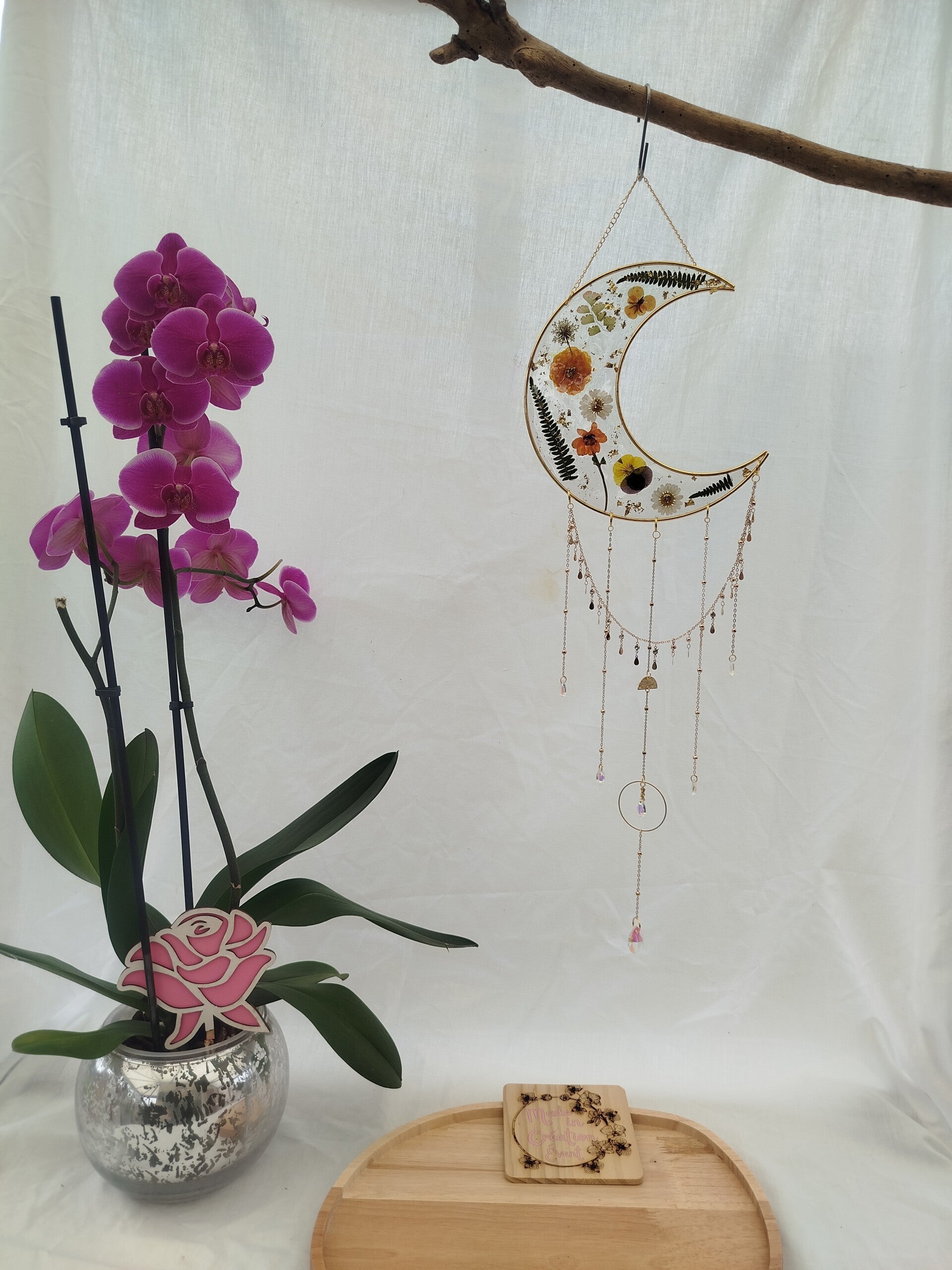 Apportez une touche de poésie et de nature à votre intérieur avec cette création artisanale unique : un capteur de soleil en forme de lune, délicatement orné de fleurs naturelles cueillies et pressées à la main.